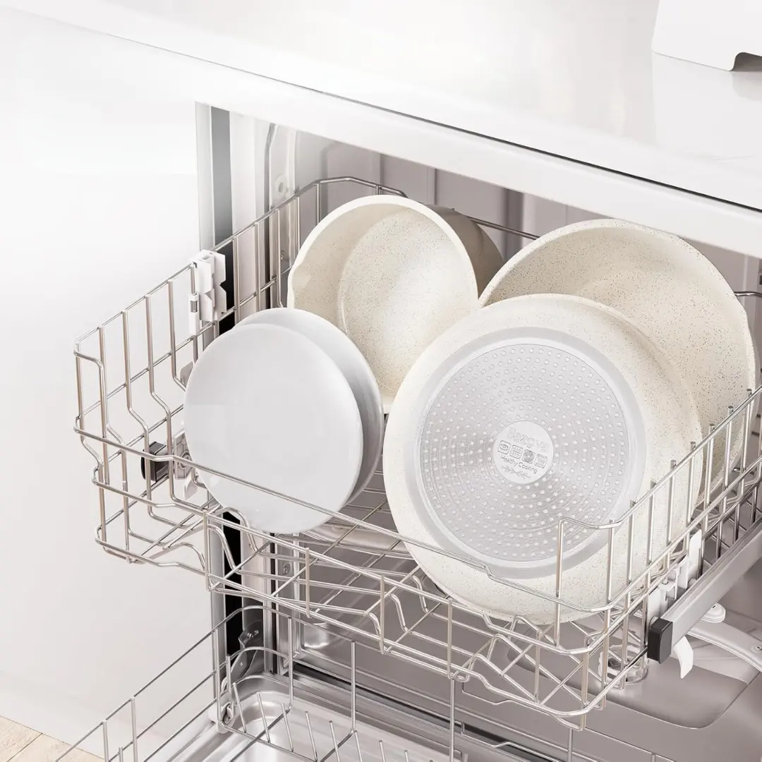 The cookware features a slippery, toxin-free nonstick ceramic coating made without potentially harmful materials such as PFAS (including PTFEs and PFOAs), lead, or cadmium.